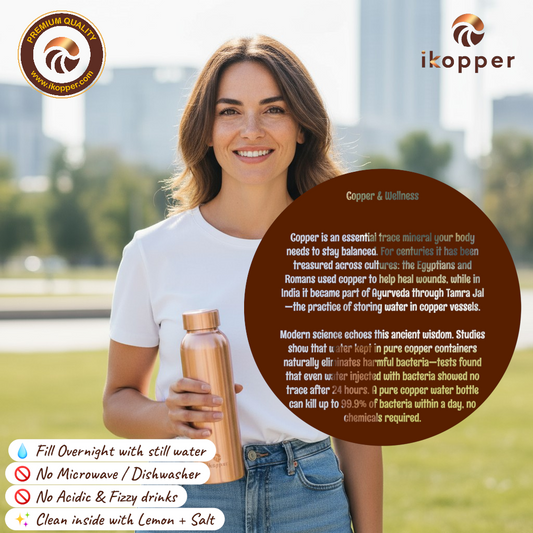 We reimagined this timeless ritual for modern life. The ikopper Copper Bottle is eco-friendly, reusable, and hand-crafted from 99.9% pure copper — designed to look beautiful wherever you take it.